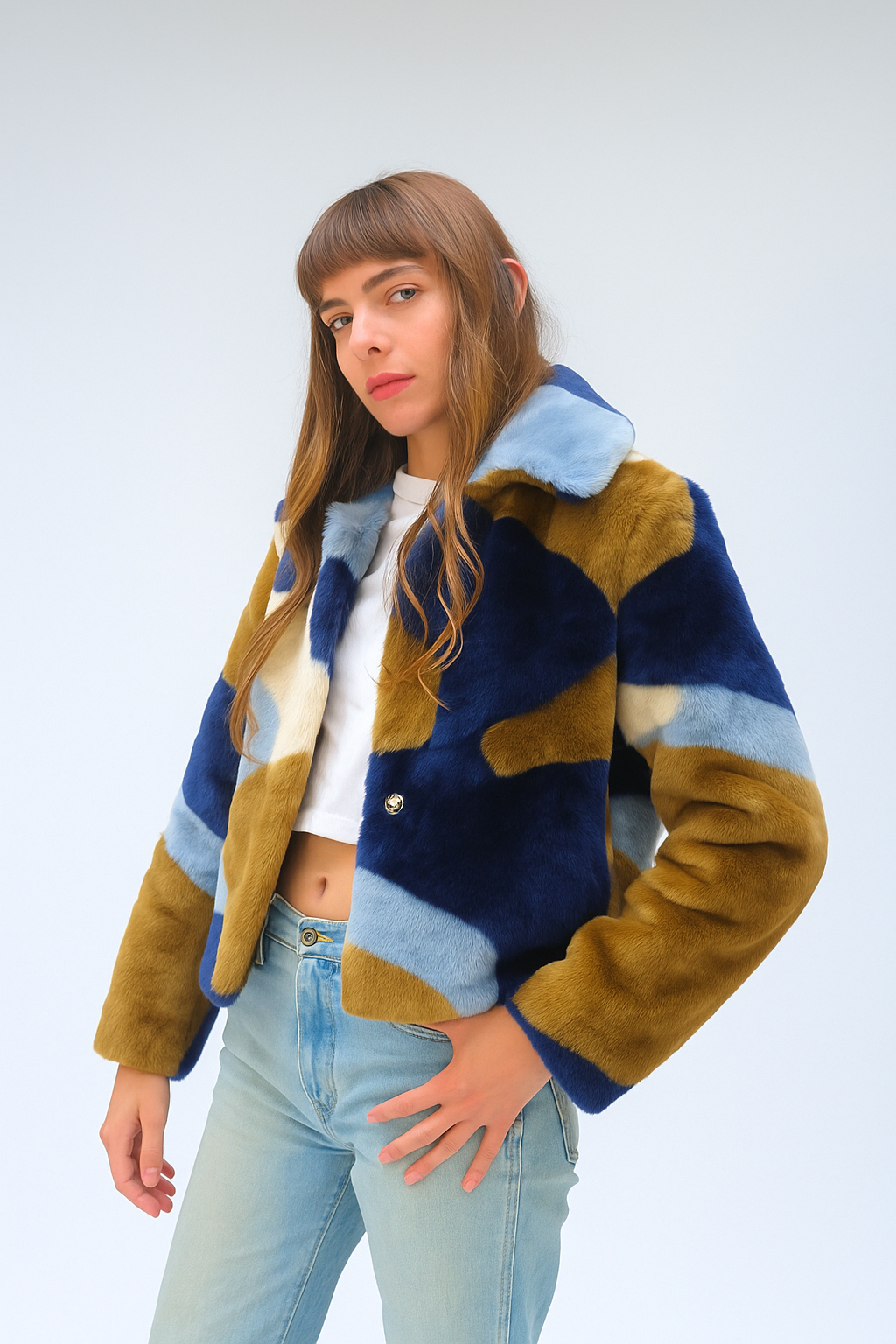 Introducing Indigo Swirl —This faux fur coat speaks in layers: grounded, cool, a little unexpected.
